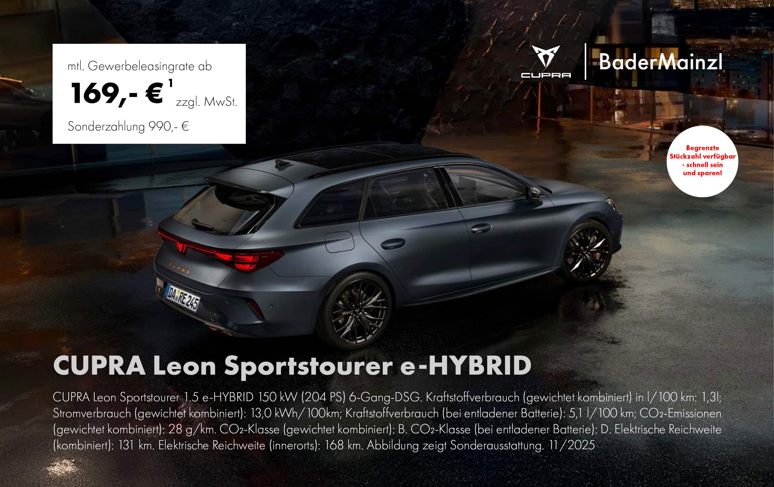 CUPRA Leon Sportstourer 1.5 e-HYBRID 150 kW (204 PS) 6-Gang-DSG. Kraftstoffverbrauch (gewichtet kombiniert) in l/100 km: 1,3l; Stromverbrauch (gewichtet kombiniert): 13,0 kWh/100km; Kraftstoffverbrauch (bei entladener Batterie): 5,1 l/100 km; CO₂-Emissionen (gewichtet kombiniert): 29 g/km. CO₂-Klasse (gewichtet kombiniert): B. CO₂-Klasse (bei entladener Batterie): D. Elektrische Reichweite (kombiniert): 131 km. Elektrische Reichweite (innerorts): 168 km. Abbildung zeigt Sonderausstattung. 11/2025