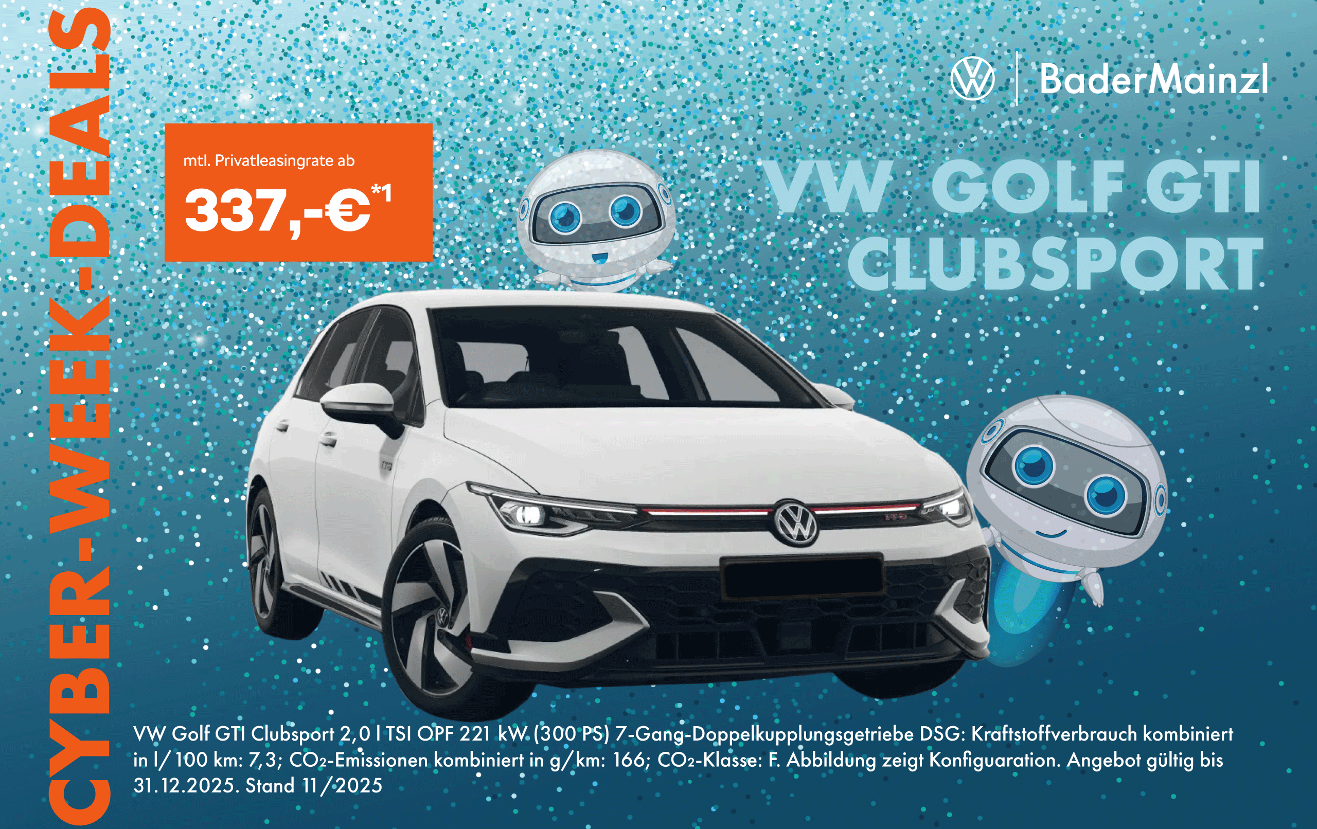 ¹ Privatleasingangebot: VW Golf GTI Clubsport 2,0 l TSI OPF 221 kW (300 PS) 7-Gang-Doppelkupplungsgetriebe DSG: Kraftstoffverbrauch kombiniert in l/100 km: 7,3; CO₂-Emissionen kombiniert in g/km: 166; CO₂-Klasse: F. Abbildung zeigt Konfiguaration. Angebot gültig bis 31.12.2025. Stand 11/2025