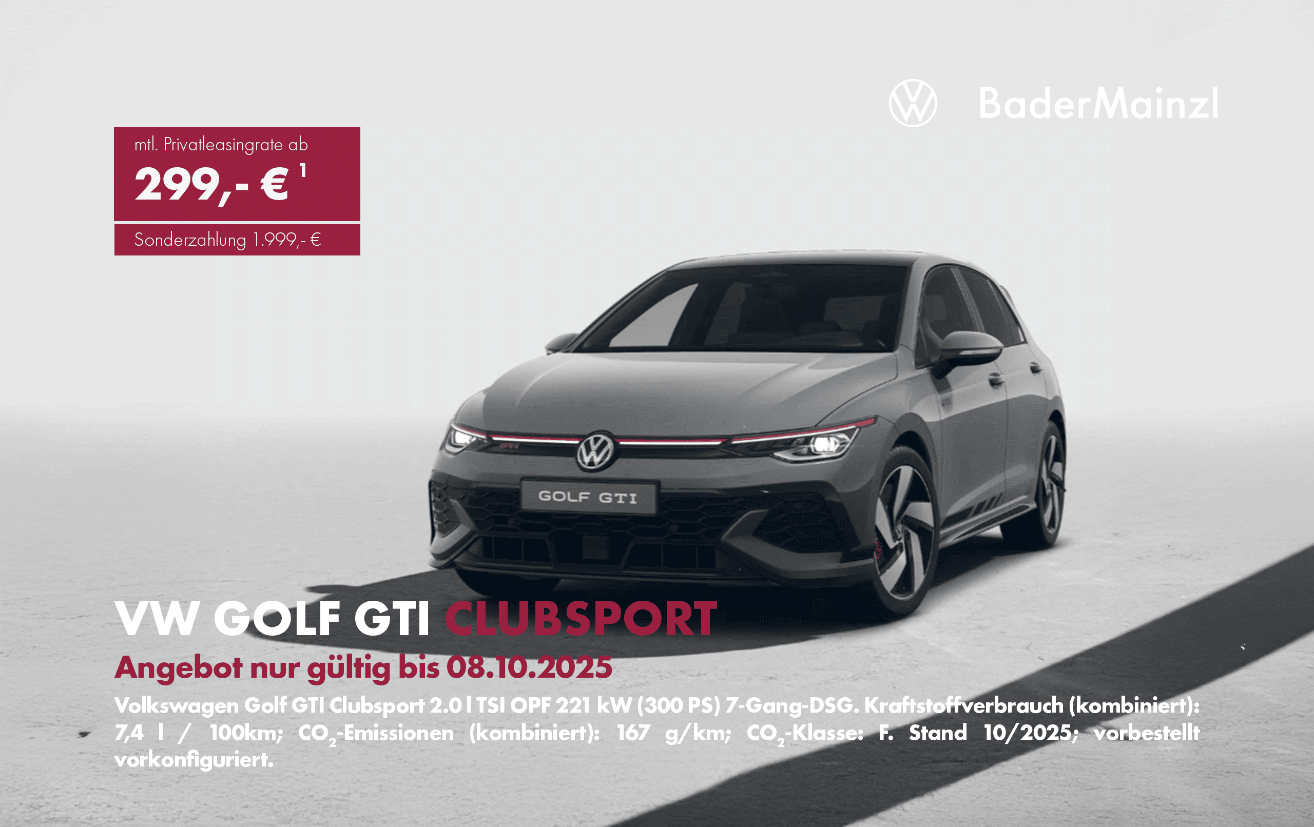 Volkswagen Golf GTI Clubsport 2.0 l TSI OPF 221 kW (300 PS) 7-Gang-DSG. Kraftstoffverbrauch (kombiniert): 7,4 l / 100km; CO2-Emissionen (kombiniert): 167 g/km; CO2-Klasse: F. Abbildung zeigt Sonderausstattung gegen Mehrpreis. Stand 10/2025; vorbestellt vorkonfiguriert.