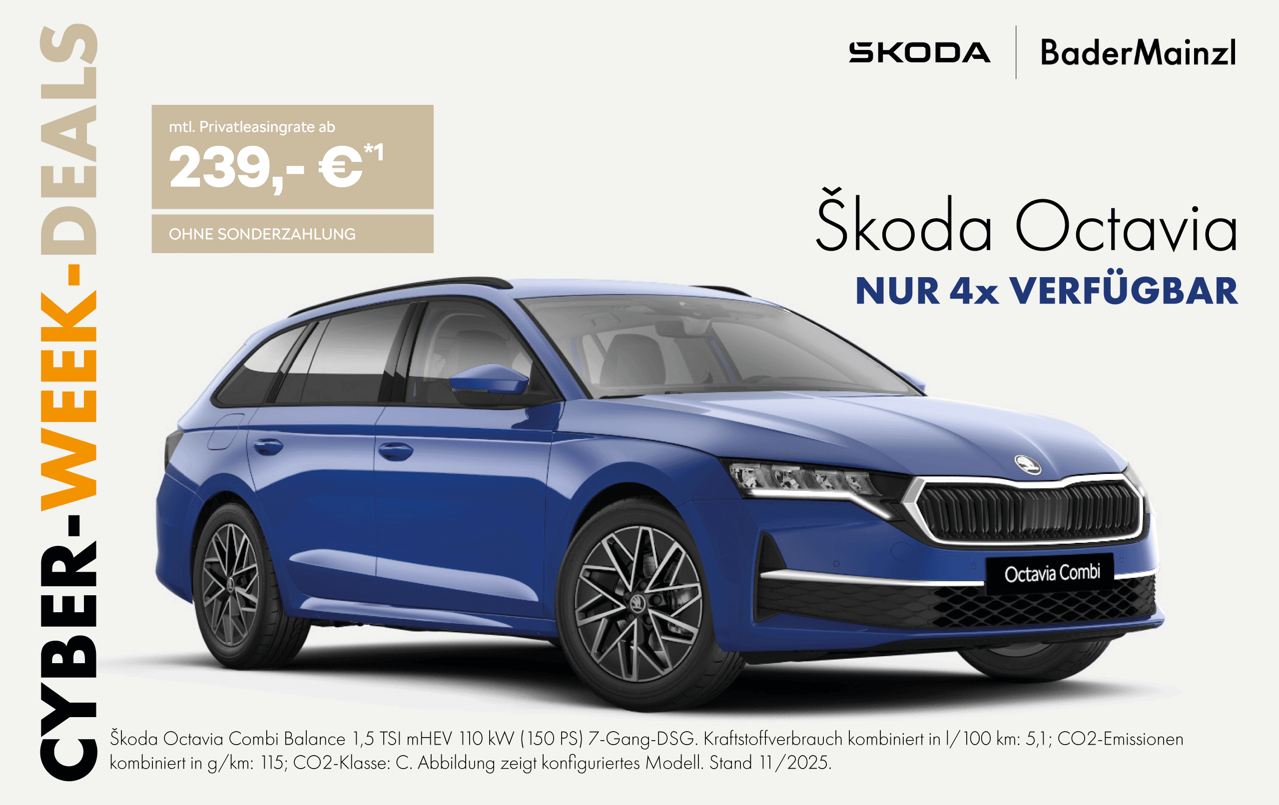 ¹ Privatleasingangebot: Škoda Octavia Combi Balance 1,5 TSI mHEV 110 kW (150 PS) 7-Gang-DSG. Kraftstoffverbrauch kombiniert in l/100 km: 5,1; CO2-Emissionen kombiniert in g/km: 115; CO2-Klasse: C. Abbildung zeigt konfiguriertes Modell. Stand 11/2025.