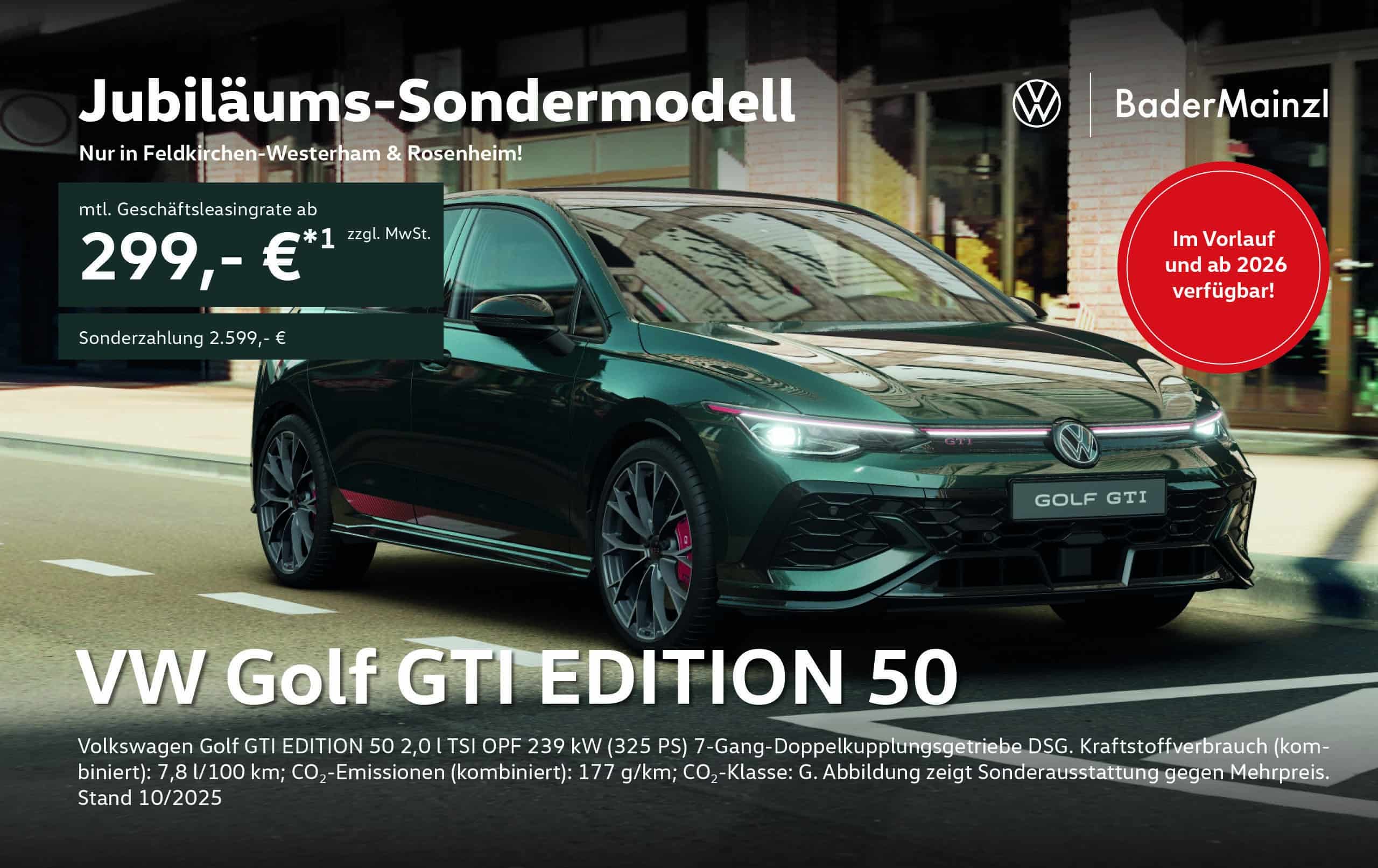 ¹ Angebot Gewerbeleasing: Volkswagen Golf GTI EDITION 50 2,0 l TSI OPF 124 kW (325 PS) 7-Gang-Doppelkupplungsgetriebe DSG. Kraftstoffverbrauch kombiniert in l/100 km: 7,8; CO₂-Emissionen kombiniert in g/km: 177. CO₂-Klasse: G. Abbildung zeigt Sonderausstattung gegen Mehrpreis. Stand 10/2025