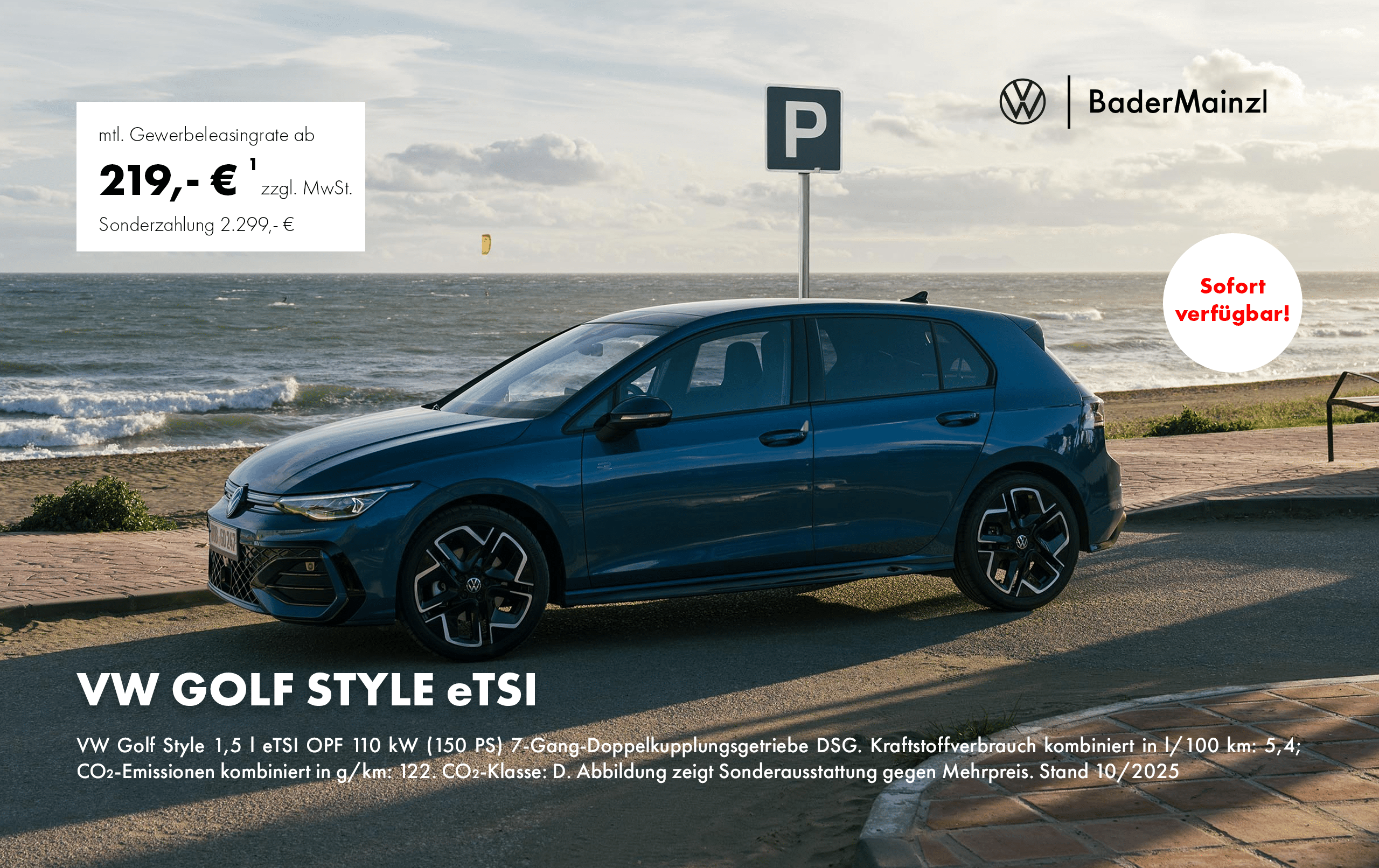 ¹ Angebot Gewerbeleasing: VW Golf Style 1,5 l eTSI OPF 110 kW (150 PS) 7-Gang-Doppelkupplungsgetriebe DSG. Kraftstoffverbrauch kombiniert in l/100 km: 5,4; CO₂-Emissionen kombiniert in g/km: 122. CO₂-Klasse: D. Abbildung zeigt Sonderausstattung gegen Mehrpreis. Stand 10/2025