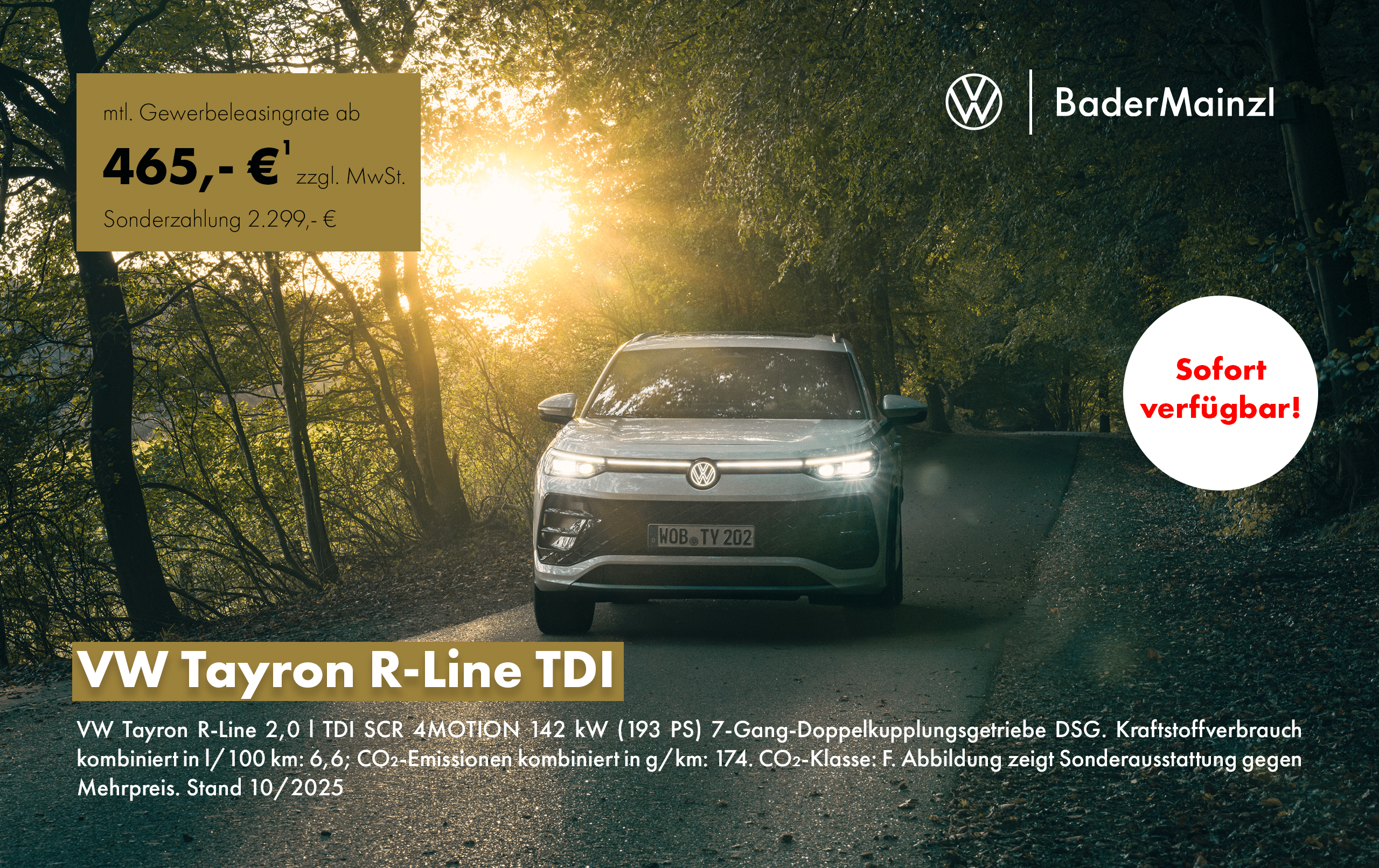 ¹ Angebot Gewerbeleasing: VW Tayron R-Line 2,0 l TDI SCR 4MOTION 142 kW (193 PS) 7-Gang-Doppelkupplungsgetriebe DSG. Kraftstoffverbrauch kombiniert in l/100 km: 6,6; CO₂-Emissionen kombiniert in g/km: 174. CO₂-Klasse: F. Abbildung zeigt Sonderausstattung gegen Mehrpreis. Stand 10/2025